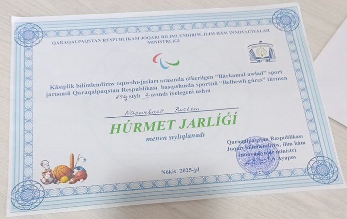 Бугин 2025-жыл 16-декабрь куни Республика жеке гурес турлерине канийгелестирилген спорт мектебинде орта арнаўлы касиплик билимлендириў оқыў орынлары арасында «Баркамал аулад» спорт жарысларынын Белбеўли гурес спорт туринен Каракалпакстан Республика баскышында Нокис каласы 1-санлы политехникумы оқыўшылары белсене қатнасып 6 окыушымыз сыйлы орынларды ийеледи. Атап айтқанда өз салмақ категорияларында 2-курс «2-1 қутқарыўшы» топары оқыўшысы Муратбаев Нызаматдин 1-орынды, 1-курс «1-2 авто двигатель» топары оқыўшысы Махсетбаев Руслан 1-орынды, 1-курс «1-2 авто двигатель» топары оқыўшысы Донгесов Багдаулет 1-орынды, 1-курс «1-2 авто двигатель» топары оқыўшысы Казакбаев Руслан 2-орынды ийеледи. Сонын менен бирге 2-курс «2-1 авто электрик» топары окыушысы Назарбаев Рустем 2-орынды, 2-курс «2-1 авто электрик» топары окыушысы Хожанов Тургалий 3-орынды ийеледи. Өз салмақ категорияларында 1-орынды ийелеген 3-оқыўшымыз Ферғана ўалиятында болып өтетуғын финал басқышына жоллама алды