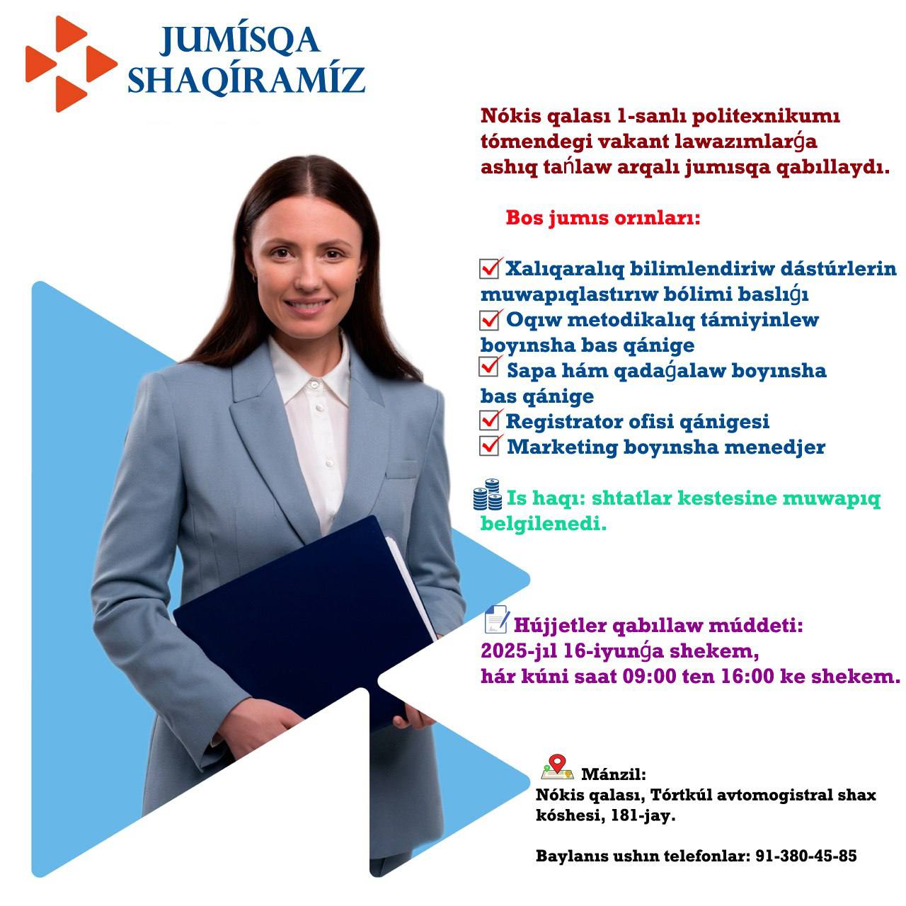 Nókis qalası 1-sanlı politexnikumı tómendegi vakant lawazımlarǵa ashıq tańlaw arqalı jumısqa mirat etedi: